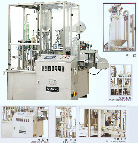 The Filling Sealing Machine specially designed for paper cup and plastic cup, integrates cup lowering, filling , cap making and sealing. It could bottle sirup, imported electrical elements and has a man-machine interface control has the character of few holding area and higher automation.